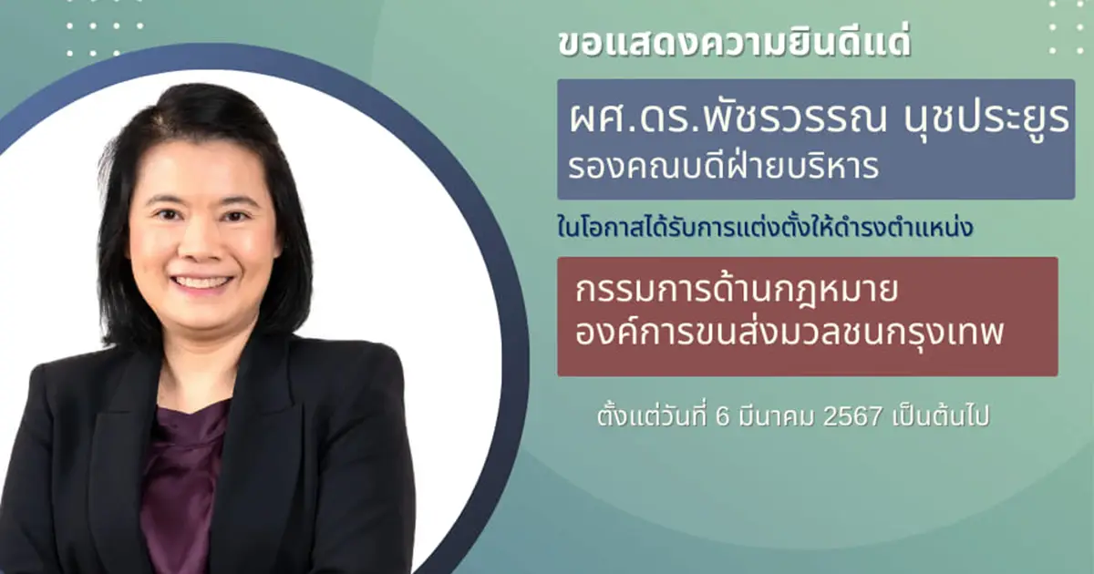 สถาบันบัณฑิตพัฒนบริหารศาสตร์ ขอแสดงความยินดีแด่ ผู้ช่วยศาสตราจารย์ ดร.พัชรวรรณ นุชประยูร รองคณบดีฝ่ายบริหาร ในโอกาสได้รับการแต่งตั้งให้ดำรงตำแหน่งกรรมการด้านกฎหมาย องค์การขนส่งมวลชนกรุงเทพ ตั้งแต่วันที่ 6 มีนาคม 2567 เป็นต้นไป