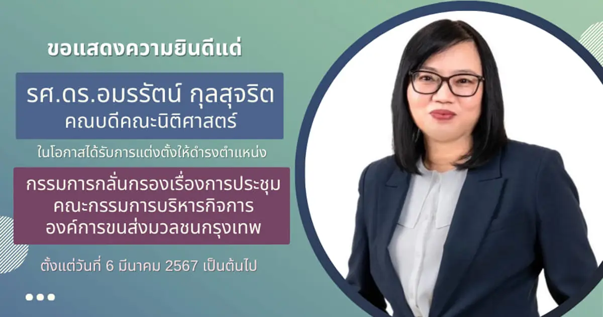 สถาบันบัณฑิตพัฒนบริหารศาสตร์ ขอแสดงความยินดีแด่ รองศาสตราจารย์ ดร.อมรรัตน์ กุลสุจริต คณบดีคณะนิติศาสตร์ ในโอกาสได้รับการแต่งตั้งให้ดำรงตำแหน่งกรรมการกลั่นกรองเรื่องการประชุม คณะกรรมการบริหารกิจการองค์การขนส่งมวลชนกรุงเทพ ตั้งแต่วันที่ 6 มีนาคม 2567 เป็นต้นไป