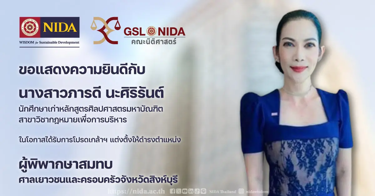 ขอแสดงความยินดีกับ นางสาวภารดี นะศิริรันต์ นักศึกษาเก่าหลักสูตรศิลปศาสตรมหาบัณฑิต สาขาวิชากฎหมายเพื่อการบริหาร ในโอกาสได้รับแต่งตั้งให้ดำรงตำแหน่งผู้พิพากษาสมทบในศาลเยาวชนและครอบครัวจังหวัดสิงห์บุรี