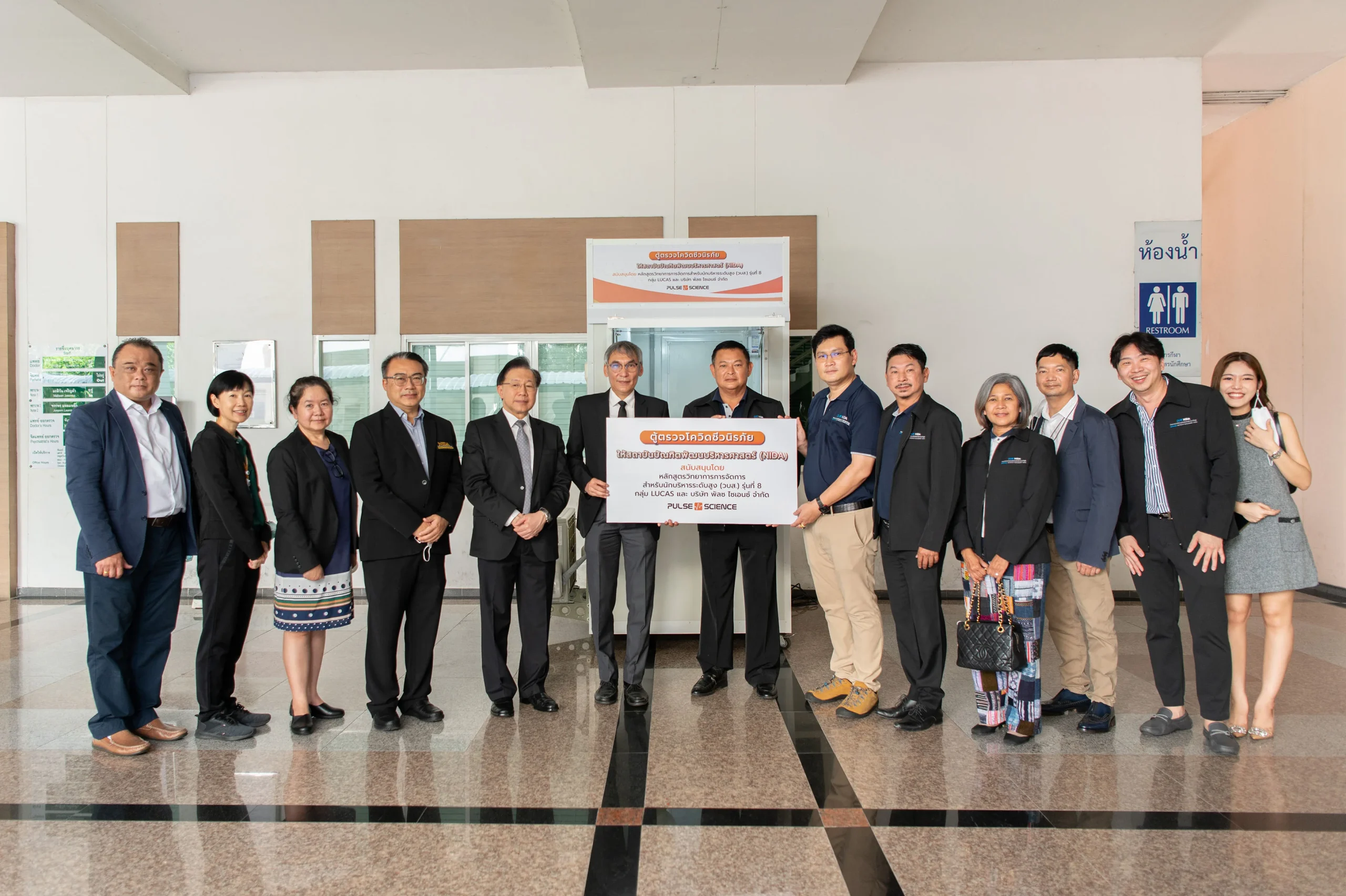วันนี้ (30 พฤศจิกายน 2565) นายนัทธี อินต๊ะเสน ประธานกรรมการบริหาร บริษัท พัลซ ไซเอนซ์ จํากัด ในฐานะผู้ประดิษฐ์รถเก็บตัวอย่างชีวนิรภัยพระราชทาน และได้สำเร็จการอบรมหลักสูตร วิทยาการการจัดการสำหรับนักบริหารระดับสูง (วบส.) รุ่นที่ 8 โดย สถาบันบัณฑิตพัฒนบริหารศาสตร์ และกลุ่ม LUCAS 8 เดินทางเข้ามอบตู้ตรวจโรคโควิดระบบชีวนิรภัยให้กับทางสถาบันบัณฑิตพัฒนบริหารศาสตร์ (นิด้า) เพื่อใช้ในกิจการของทางสถาบัน เช่น การรับพระราชทานปริญญา และการอบรมหลักสูตรที่มีผู้เข้าร่วมกิจกรรมจำนวนมาก โดยไม่คิดค่าใช้จ่ายและไม่มีค่าใช้จ่ายต่อเนื่อง และไม่มีผลประโยชน์อื่นต่างตอบแทน โดยในครั้งนี้ ได้รับเกียรติจาก ผู้ช่วยศาสตราจารย์ ดร.สุเทพ ทองงาม รองอธิการบดีฝ่ายบริหารและเทคโนโลยีดิจิทัล รองศาสตราจารย์ ดร.สมบัติ กุสุมาวลี รองอธิการบดีฝ่ายวิชาการและกิจการนานาชาติ และรองศาสตราจารย์ ดร.มนตรี โสคติยานุรักษ์ ผู้อำนวยการหลักสูตรวิทยาการการจัดการสำหรับนักบริหารระดับสูง (วบส.) พร้อมด้วยตัวแทนบุคลากรของสถาบัน ในการรับมอบตู้ตรวจโควิดระบบชีวนิรภัยดังกล่าว ณ ห้องพยาบาล อาคารชุบ กาญจนประกร สถาบันบัณฑิตพัฒนบริหารศาสตร์