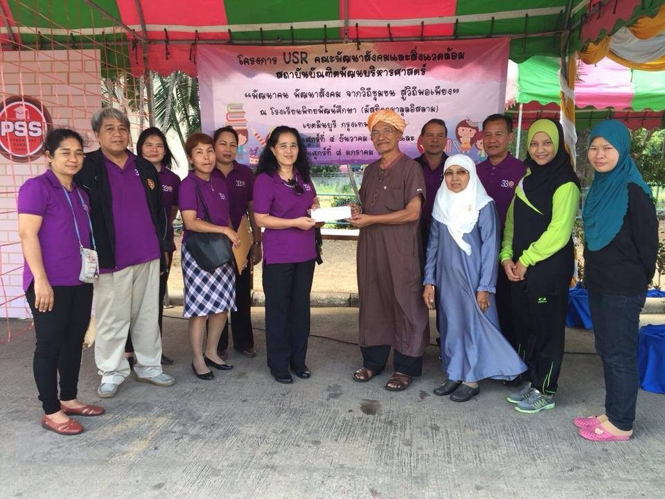 เมื่อวันศุกร์ที่ 4 ธันวาคม 2558 บุคลากรคณะพัฒนาสังคมและสิ่งแวดล้อม สถาบันบัณฑิตพัฒนบริหารศาสตร์ นำโดย รศ.ดร.จินตนา อมรสงวนสิน รองคณบดีฝ่ายบริหาร ได้เดินทางไปยังโรงเรียนพิทยพัฒน์ศึกษา (มัสยิดกมาลุลอิสลาม) เพื่อมอบเงินสมทบทุนสร้างอาคารเรียนใหม่ และศึกษาดูงานวิถีชุมชน ฟาร์มเลี้ยงแกะ โรงงานเย็บผ้าและน้ำพริกแม่บ้านตาลเดี่ยว