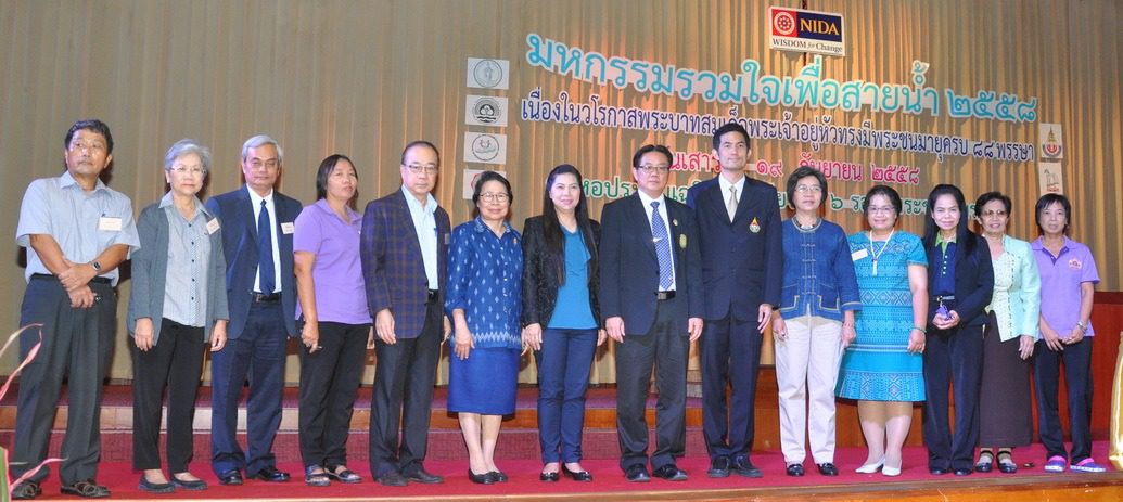 วันเสาร์ที่ 19 กันยายน 2558 กลุ่มงานสื่อสารองค์การและกิจกรรมเพื่อสังคมสถาบันบัณฑิตพัฒนบริหารศาสตร์ ร่วมกับ กรุงเทพมหานคร กรมส่งเสริมคุณภาพสิ่งแวดล้อมโรงเรียน สาธิต มศว. ประสานมิตร สถาบันนโยบายศึกษาโดยการสนับสนุนของมูลนิธิคอนราดอเดนาวร์ สมาคมนักเรียนเก่าญี่ปุ่นฯ และโครงการประชารวมใจคืนความสดใสให้คลองแสนแสบ จัดงาน มหกรรมรวมใจเพื่อสายน้ำ 2558 หัวข้อ การสร้างความสามารถของพลเมืองเรื่องสิ่งแวดล้อม เนื่องในโอกาสพระบาทสมเด็จพระเจ้าอยู่หัวทรงมีพระชนมพรรษา88 พรรษา กล่าวรายงานโดย ผศ.ดร.แตงอ่อน มั่นใจตน ผู้อำนวยการโครงการประชารวมใจคืนความสดใสให้คลองแสนแสบ โดย ผศ.ดร.จุฑารัตน์ ชมพันธุ์ ผู้ช่วยอธิการบดีฝ่ายกิจกรรมเพื่อสังคม ให้เกียรติเป็นประธานกล่าวเปิดงาน