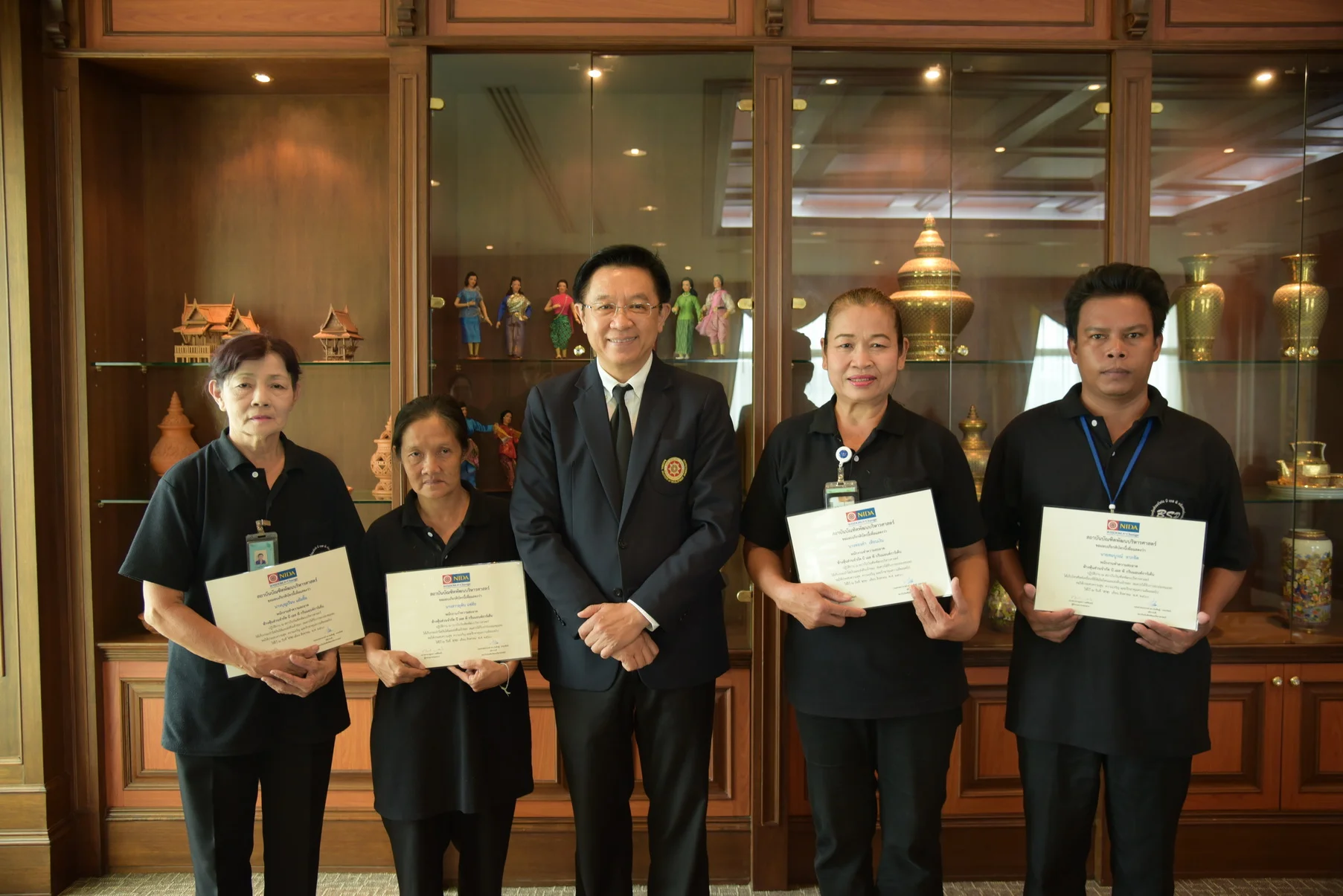 เมื่อวันที่ 25 สิงหาคม 2560 รศ.ดร.ประดิษฐ์ วรรณรัตน์ อธิการบดีสถาบันบัณฑิตพัฒนบริหารศาสตร์ ได้มอบเกียรติบัตรให้กับพนักงานทำความสะอาดที่ทำความดีโดยการเก็บของที่มีมูลค่าและส่งคืนให้กับเจ้าของ จำนวน 4 คน ได้แก่ นางบุญเรือน แย้มยิ้ม นางสาวยุพิน แซ่ฮ้อ นายสมบูรณ์ ลาภจิต และ นางทองคำ เทียนเงิน ซึ่งทั้ง 4 คน พนักงานของห้างหุ้นส่วนจำกัด บี เอส พี กรีนแอนด์การ์เด้น ที่รับจ้างเหมาทำความสะอาดพื้นที่ภายในสถาบัน นอกจากนี้ ท่านอธิการบดี ได้กล่าวชมเชยและขอบคุณที่ได้กระทำความดีซึ่งเป็นการสร้างภาพลักษณ์ที่ดีให้กับสถาบัน