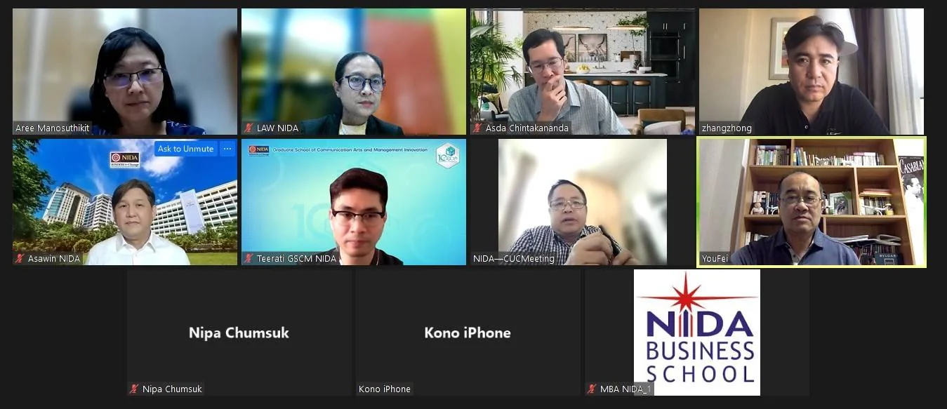 คุณนิภา ชุมสุข หัวหน้ากลุ่มงานกิจการนานาชาติ และ คุณสุพิชญ์ชา คนชม นักวิเทศสัมพันธ์ กลุ่มงานกิจการนานาชาติ เข้าร่วมการประชุมผ่านระบบประชุมทางไกลออนไลน์โปรแกรม Zoom กับ Dr. You Fei, Dr. Chen Xiaochun และ Dr. Zhang Zhong, Communication University of China (CUC), สาธารณรัฐประชาชนจีน โดยมีเนื้อหาการหารือเกี่ยวกับการสร้างความร่วมมือทางวิชาการระหว่างสถาบัน เรื่องการส่งนักศึกษามาศึกษาต่อระดับปริญญาเอก ณ สถาบัน