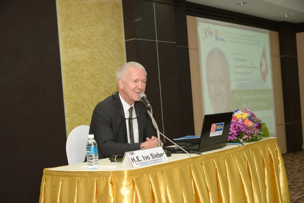 ภายในงานได้รับเกียรติจาก ฯพณฯ อีโว ซีเบอร์ เอกอัครราชทูตสมาพันธรัฐสวิส ประจำราชอาณาจักรประเทศไทย ราชอาณาจักรกัมพูชา สาธารณรัฐประชาธิปไตยประชาชนลาว ปาฐกถาโดย ในหัวข้อ “Switzerland – successfully harnessing opportunities of globalization” สมาพันธรัฐสวิส – โอกาสในการควบคุมที่ประสบความสำเร็จในยุคโลกาภิวัฒน์