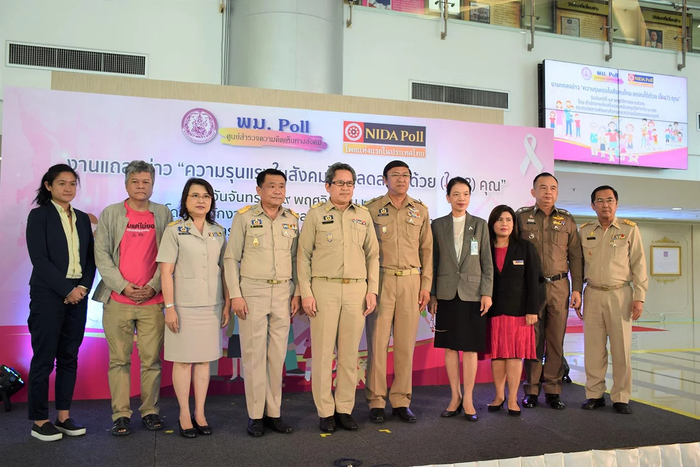 ระหว่างเดือนตุลาคม – พฤศจิกายน พ.ศ. 2561 จากประชาชนที่มีอายุ 15 ปีขึ้นไป กระจายทุกภูมิภาค จำนวน 4,800 หน่วยตัวอย่าง และจัดให้มีการแถลงผลการสำรวจในวันจันทร์ที่ 19 พฤศจิกายน 2561 ณ ห้องโถงกลาง ชั้น 1 กระทรวงการพัฒนาสังคมและความมั่นคงของมนุษย์ โดยนายปรเมธี วิมลศิริ ปลัดกระทรวงการพัฒนาสังคมและความมั่นคงของมนุษย์ ได้แถลงผลการสำรวจเกี่ยวกับความรุนแรงในสังคมส่วนใหญ่ที่ประชาชนนึกถึงพบว่า ร้อยละ 55.04 การทำร้ายร่างกาย ร้อยละ 23.85 การล่วงละเมิดทางเพศ และร้อยละ 15.38 การทำร้ายจิตใจด้วยวาจาและสีหน้าท่าทาง โดยปัจจัยที่ก่อให้เกิดความรุนแรง 3 อันดับแรก ประชาชนส่วนใหญ่คิดว่าอันดับ 1 คือ สุรา/ยาเสพติด อันดับ 2 คือ การอบรมเลี้ยงดู อันดับ 3 คือ การคบเพื่อน