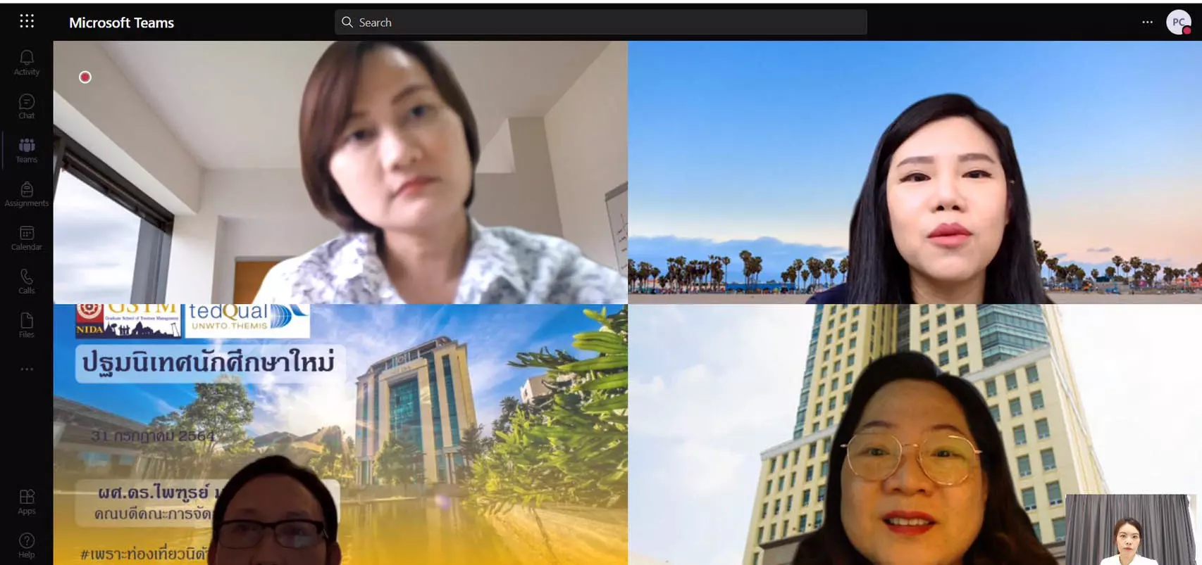 วันที่ 13 สิงหาคม 2564 รศ.ดร.กนกกานต์ แก้วนุช ผู้ช่วยอธิการบดีฝ่ายกิจการนานาชาติ ผศ.ดร.ไพฑูรย์ มนต์พานทอง คณบดีคณะการจัดการการท่องเที่ยว ผศ.ดร.แสงแข บุญศิริรองคณบดีฝ่ายวิชาการ คณะการจัดการการท่องเที่ยว และเจ้าหน้าที่กลุ่มงานกิจการนานาชาติ เข้าร่วมการประชุมผ่านระบบประชุมทางไกลออนไลน์โปรแกรม Microsoft Teams กับ คุณปณิชา แป้นพัฒน์ ตำแหน่งหัวหน้าสาขาวิชาการจัดการธุรกิจ (หลักสูตรนานาชาติ)