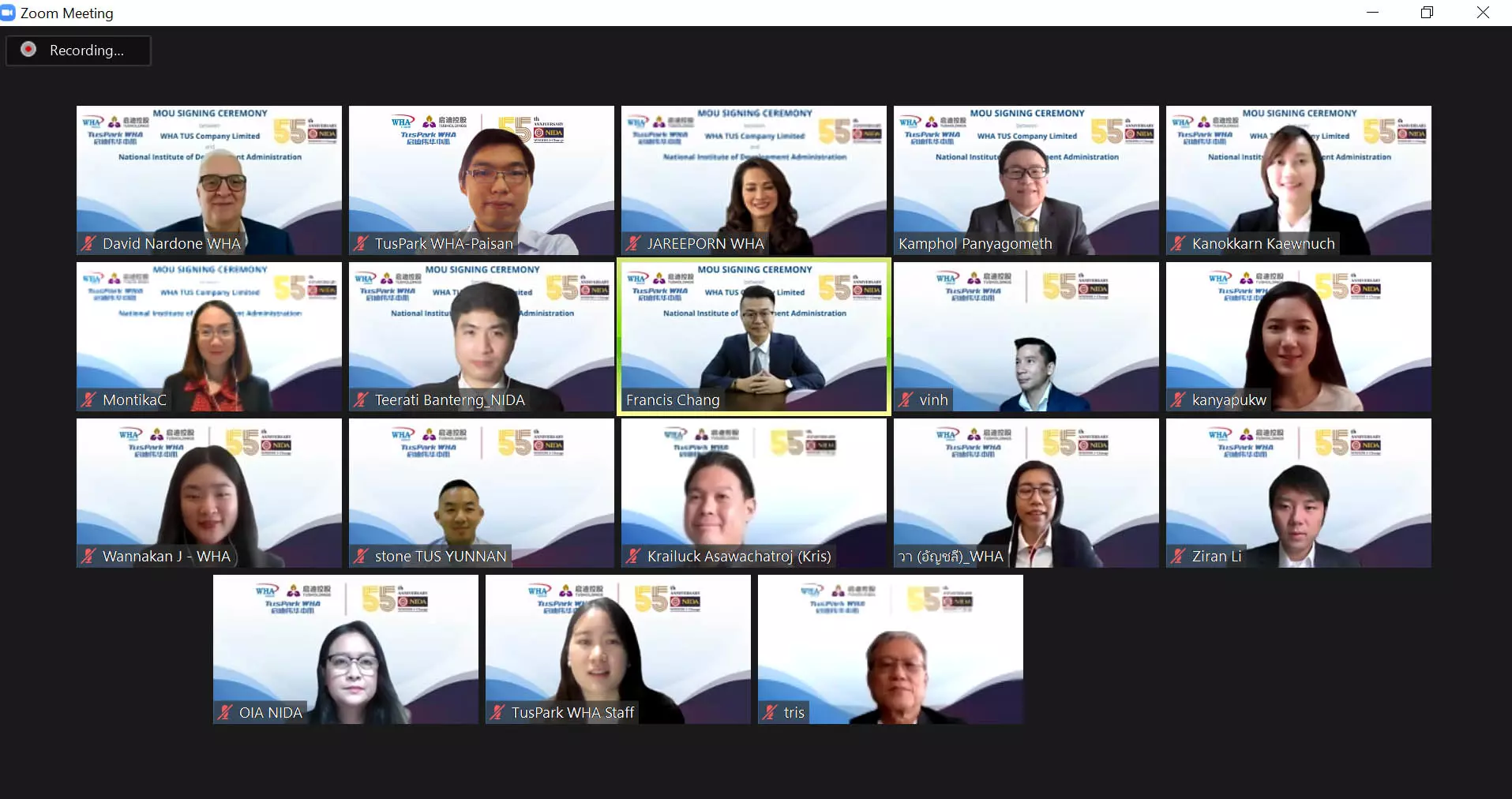 กับ คุณจรีพร จารุกรสกุล ประธานคณะกรรมการบริษัท และประธานเจ้าหน้าที่บริหาร WHA Corporation PCL, Mr. David Nardone, Group Executive Industrial and International WHA Industrial Development Plc., Mr. Yuheng Chang, Chief Executive Officer of WHA TUS Co., Ltd, คุณมณฑิกา เจริญยิ่งวัฒนา ผู้อำนวยการ ฝ่ายพัฒนากลยุทธ์ธุรกิจ WHA Corporation PCL และผู้แทนจาก TUSPARK WHA ผ่านโปรแกรม Zoom เพื่อสร้างความร่วมมือทางวิชาการระหว่างสถาบันกับ TUSPARK WHA นอกจากนี้ได้มีการประชุมหารือเรื่องความร่วมมือทางวิชาการระหว่างกัน