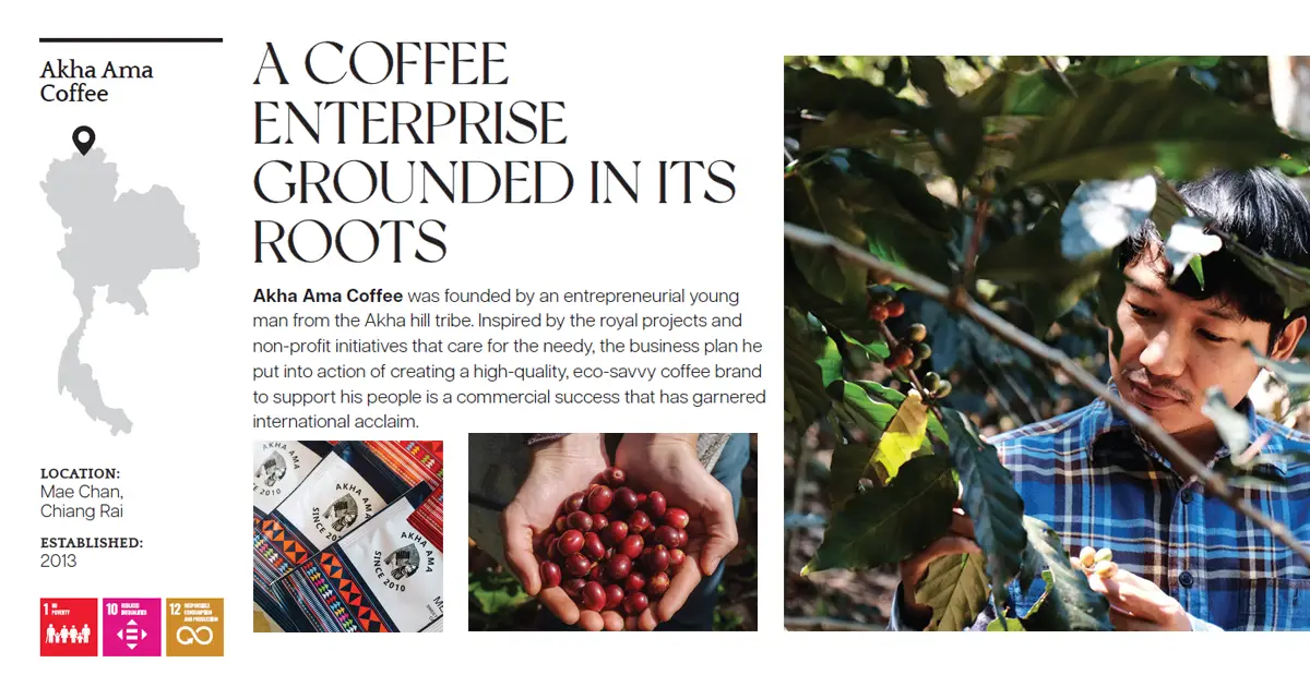 “(กาแฟ) มีศักยภาพในการเติบโตสูงสุด มีมูลค่ารองจากน้ำมัน” อายุ เชื้อปา จากชุมชนชาวเขาอาข่าที่ยากจน ผู้ก่อตั้งกาแฟอาข่าอาม่า ที่ได้รับแรงบันดาลใจจากโครงการหลวง ในการทำธุรกิจแบบไม่แสวงหาผลกำไรแต่มุ่งดูแลผู้ยากไร้ และเป็นแผนธุรกิจที่เขานำไปใช้ในการสร้างแบรนด์กาแฟคุณภาพสูงและเป็นมิตรกับสิ่งแวดล้อมเพื่อช่วยเหลือชนเผ่าของเขา จนประสบความสำเร็จทางการค้าและได้รับการยกย่องจากนานาชาติ
