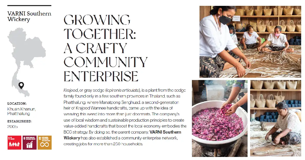 วิสาหกิจชุมชนที่สานต่อธุรกิจหัตถกรรมของครอบครัว ‘กระจูด’ ที่มีมากในพื้นที่ มาเพิ่มมูลค่าด้วยการนำความรู้ด้านศิลปะและเทคโนโลยีสมัยใหม่มาออกแบบพัฒนาสินค้า นับตั้งแต่การเพิ่มวัสดุประกอบ เช่น ผสมใบลาน ต่อยอดลวดลวยทอให้หลากหลาย พัฒนาเทคนิคย้อมและใช้สีย้อมธรรมชาติ จนคว้ารางวัลด้านการออกแบบมากมาย สร้างสมดุลในการทำธุรกิจ รักษาสิ่งแวดล้อม และคุณภาพชีวิต
