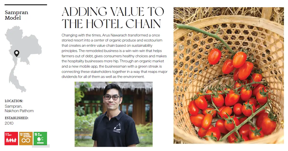 คุณอรุษ นวราช ทายาทรุ่นที่ 3 ของรีสอร์ตธุรกิจครอบครัวบนพื้นที่ 130 ไร่ ที่เปิดให้บริการตั้งแต่ปี 2505 ได้รับแรงบันดาลใจจาก “เศรษฐกิจพอเพียง” มาพลิกโฉมสวนสามพราน ด้วยการรีแบรนด์และเปิดตัวใหม่ในปี 2553 เป็นสามพรานโมเดล – แหล่งท่องเที่ยวเชิงนิเวศที่เป็นศูนย์กลางของเครือข่ายเกษตรอินทรีย์ และลูกค้ายังสามารถสัมผัสวัฒนธรรมไทยแบบดั้งเดิม สถาปัตยกรรมท้องถิ่น และเพลิดเพลินกับอาหารที่ปรุงด้วยวัตถุดิบออร์แกนิกที่สดใหม่ เป็น win-win-win โมเดลที่ช่วยให้เกษตรกรหลุดพ้นจากหนี้สิน ผู้บริโภคมีสุขภาพที่ดี และธุรกิจบริการที่ทันต่อยุคสมัย ผ่านตลาดเกษตรอินทรีย์ และแอพมือถือ TOCA ที่เชื่อมโยงผู้มีส่วนได้ส่วนเสียบนห่วงโซ่อาหารเข้าด้วยกัน