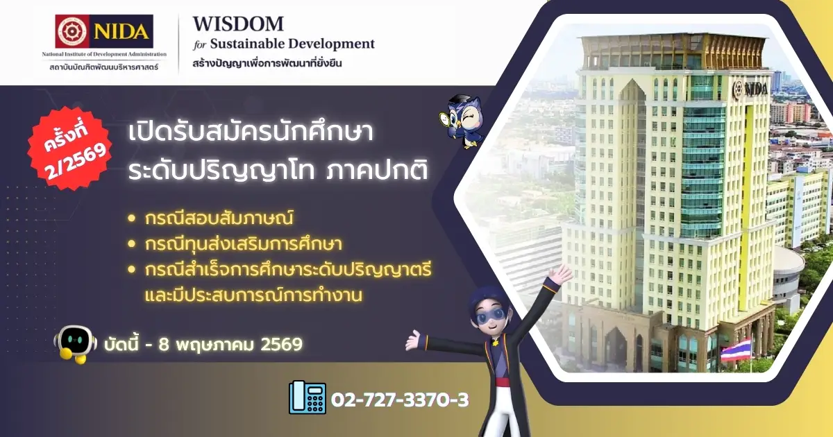 >>> ประกาศสถาบันบัณฑิตพัฒนบริหารศาสตร์ เรื่อง รับสมัครเข้าศึกษาระดับปริญญาโท ภาคปกติ ครั้งที่ 2/2569
