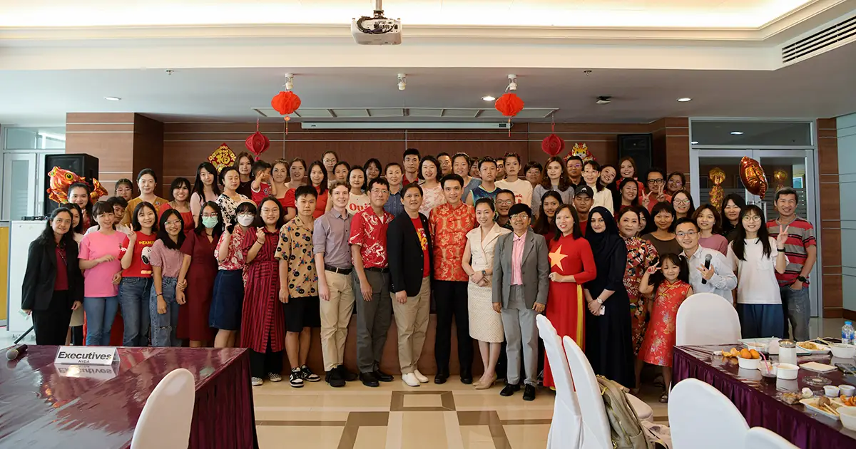 วันจันทร์ที่ 5 กุมภาพันธ์ 2567 ส่วนวิเทศสัมพันธ์ กองวิเทศสัมพันธ์และสื่อสารองค์การได้จัดงานตรุษจีน ณ ห้อง 805 ชั้น 8 อาคารนราธิปพงศ์ประพันธ์ เพื่อสร้างความสัมพันธ์อันดีระหว่างผู้บริหารสถาบัน คณาจารย์ บุคลากร นักศึกษาต่างชาติ และนักศึกษาไทยที่ศึกษาหลักสูตรภาษาอังกฤษและนานาชาติของสถาบันฯ และให้ความรู้เรื่องวันตรุษจีนและแลกเปลี่ยนศิลปวัฒนธรรมระหว่างนักศึกษานานาชาติ โดยมีผู้เข้าร่วมงานทั้งสิ้นประมาณ 60 คน จาก 7 ประเทศ ได้แก่ สาธารณรัฐแห่งสหภาพเมียนมา สาธารณรัฐสังคมนิยมเวียดนาม สาธารณรัฐประชาชนจีน สหพันธ์สาธารณรัฐประชาธิปไตยเนปาล สาธารณรัฐอิสลามปากีสถาน สหพันธรัฐรัสเซีย และประเทศไทย ตามลำดับ ทั้งนี้ ทางสถาบันฯ ได้รับเกียรติจาก ผู้ช่วยศาสตราจารย์ ดร.ภัทราวุธ เจริญรูป ผู้ช่วยอธิการบดีฝ่ายกิจการนานาชาติ รองศาสตราจารย์ ดร.อัศวิน เนตรโพธิ์แก้ว ผู้ช่วยอธิการบดีฝ่ายสื่อสารองค์การ รองศาสตราจารย์ Goto Hiroki อาจารย์ประจำ คณะภาษาและการสื่อสาร นางหทัยกาญจน์ แม็คลอลิน ผู้อำนวยการกองอำนวยการบริการงานวิทยาลัยนานาชาติ นางสาวนิภา ชุมสุข ผู้อำนวยการกองวิเทศสัมพันธ์และสื่อสารองค์การ และเจ้าหน้าที่กองวิเทศสัมพันธ์และสื่อสารองค์การ ซึ่งการแสดงบนเวทีเริ่มต้นด้วยการแบ่งปันประสบการณ์การจัดงานตรุษจีน การสาธิตการทำเกี๊ยว การแสดงดนตรีและร้องเพลงจีนจากผู้บริหารและนักศึกษา ซึ่งการจัดกิจกรรมดังกล่าวสำเร็จลุล่วงไปได้ด้วยดี