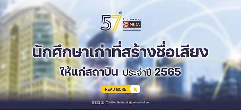 ในโอกาสครบรอบ 57 ปี แห่งการสถาปนาสถาบันบัณฑิตพัฒนบริหารศาสตร์ สถาบันฯ ได้จัดให้มีการมอบรางวัลแก่นักศึกษาเก่าที่สร้างชื่อเสียงให้แก่สถาบันบัณฑิตพัฒนบริหารศาสตร์ ประจำปี 2565 ที่ได้รับการประกาศเกียรติคุณยกย่องในด้านวิชาการ วิชาชีพ คุณธรรม จริยธรรม กีฬา สุขภาพ ศิลปวัฒนธรรม และด้านสิ่งแวดล้อม ในระดับชาติและนานาชาติ