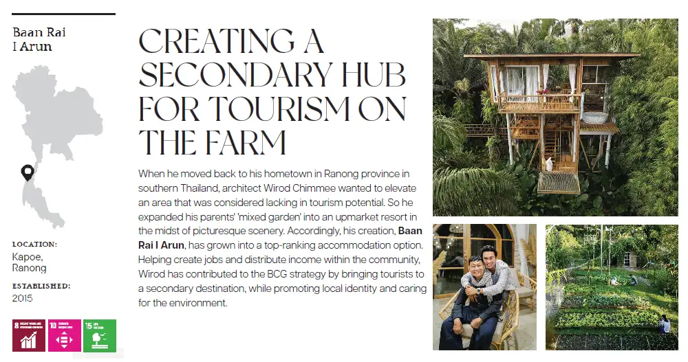 ฟาร์มสเตย์ที่มุ่งสร้าง ‘ความสุขที่ยั่งยืน’ ตามหลักพอเพียง บ้านไร่ไออรุณเติบโตอย่างค่อยเป็นค่อยไป ช่วยสร้างงาน-กระจายรายได้ให้คนในชุมชน สอดรับกับยุทธศาสตร์การพัฒนาแหล่งท่องเที่ยว ‘เมืองรอง’ ของ BCG Economy Model ที่ให้ความสำคัญกับการส่งเสริมอัตลักษณ์เฉพาะถิ่น การดูแลสภาพแวดล้อม และการท่องเที่ยวเชิงความรู้