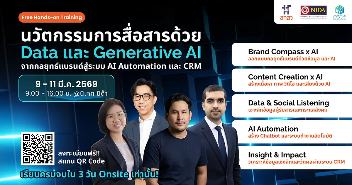 - Day 2: Data & Social Listening: เจาะลึกข้อมูลผู้รับสารและกระแสสังคม AI Automation: สร้าง Chatbot และระบบทำงานอัตโนมัติ