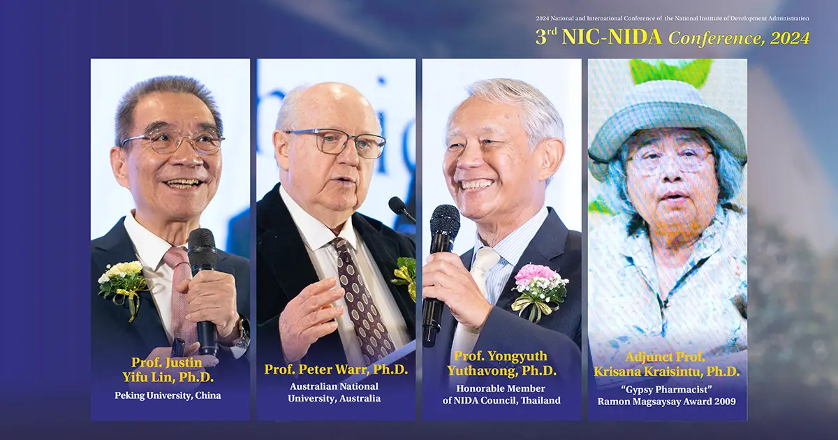 สถาบันบัณฑิตพัฒนบริหารศาสตร์ (NIDA) ร่วมกับ East China Normal University (ECNU) คว้า Keynote Speakers ระดับ Top ของโลก ได้แก่ 1) Prof. Justin Yifu Lin, Ph.D. (Peking University, China) 2) Prof. Peter Warr, Ph.D. (Australian National University, Australia) 3) Prof. Yongyuth Yuthavong, Ph.D. (Honorable Member of NIDA Council, Thailand) และ 4) Adjunct Prof. Krisana Kraisintu, Ph.D. (Ramon Magsaysay Award 2009) ขึ้นปาฐกถาพิเศษบนเวทีประชุมวิชาการระดับชาติ และระดับนานาชาติ ประจำปี 2567 (2024 National and International Conference of The National Institute of Development Administration) หรืองาน 3rd NIC – NIDA Conference, 2024 ภายใต้หัวข้อ “Redesigning our Common Future for Sustainable Transformation” เพื่อเป็นพื้นที่แลกเปลี่ยนองค์ความรู้และร่วมกันออกแบบอนาคตใหม่สู่การเปลี่ยนแปลงที่ยั่งยืน ระหว่างวันที่ 22 และ 23 สิงหาคม 2567 ณ หอประชุมเฉลิมพระเกียรติฯ สถาบันบัณฑิตพัฒนบริหารศาสตร์ ถนนเสรีไทย กรุงเทพฯ