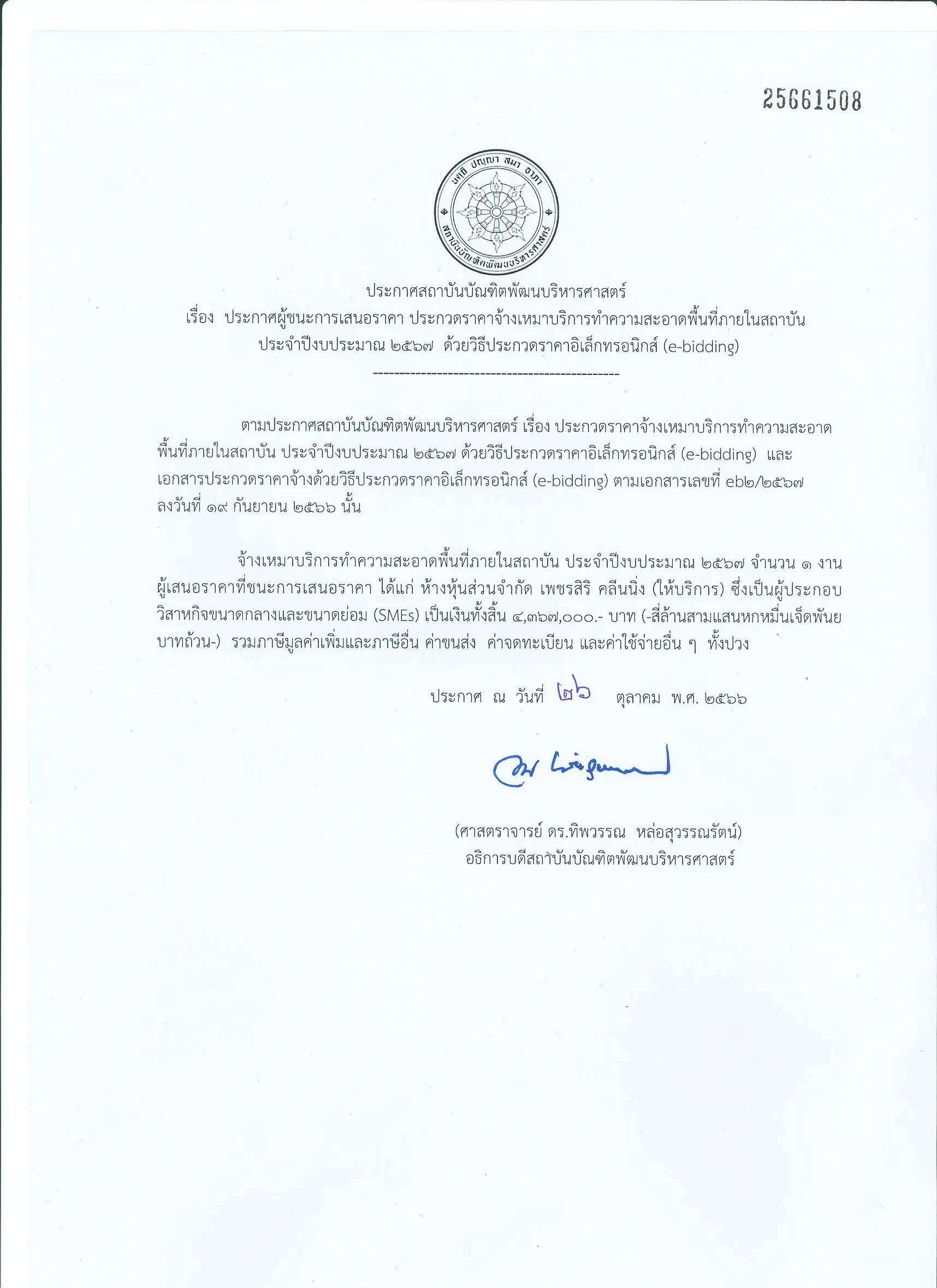 ผู้เสนอราคาที่ชนะการเสนอราคา ได้แก่ ห้างหุ้นส่วนจำกัด เพชรสิริ คลีนนิ่ง (ให้บริการ) ซึ่งเป็นผู้ประกอบวิสาหกิจขนาดกลางและขนาดย่อม (SMEs) เป็นเงินทั้งสิ้น 4,367,000- บาท (-สี่ล้านสามแสนหกหมื่นเจ็ดพันบาทถ้วน-) รวมภาษีมูลค่าเพิ่มและภาษีอื่น ค่าขนส่ง ค่าจดทะเบียน และค่าใช้จ่ายอื่น ๆ ทั้งปวง