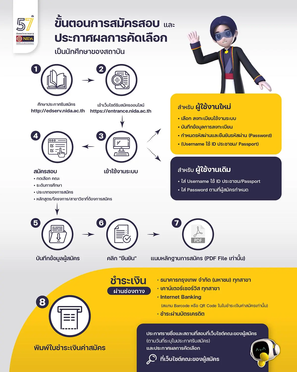 - ประกาศสถาบันบัณฑิตพัฒนบริหารศาสตร์ เรื่อง ช่องทางอิเล็กทรอนิกส์สำหรับการติดต่อสถาบันบัณฑิตพัฒนบริหารศาสตร์