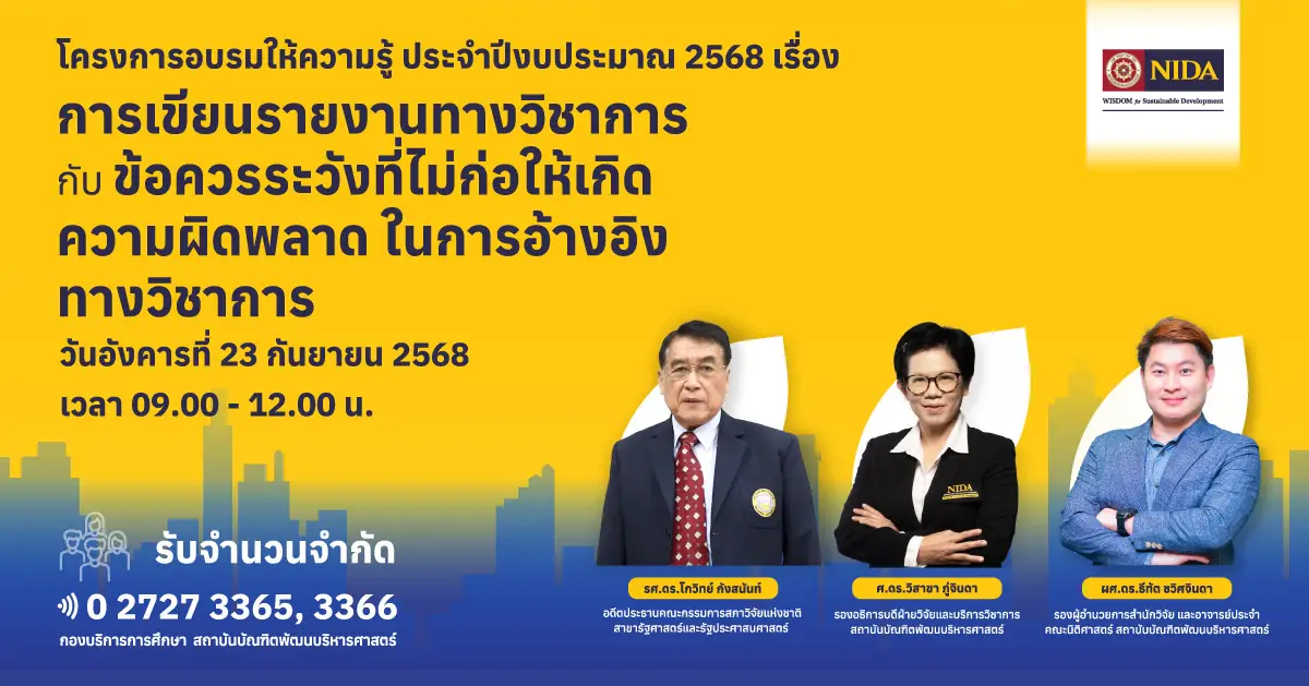 ‘นิด้า’ ขอเชิญชวนนักศึกษาและผู้สนใจทุกท่านเข้าร่วม โครงการอบรมให้ความรู้ เรื่อง “การเขียนรายงานทางวิชาการกับข้อควรระวังที่ไม่ก่อให้เกิดความผิดพลาดในการอ้างอิงทางวิชาการ”
