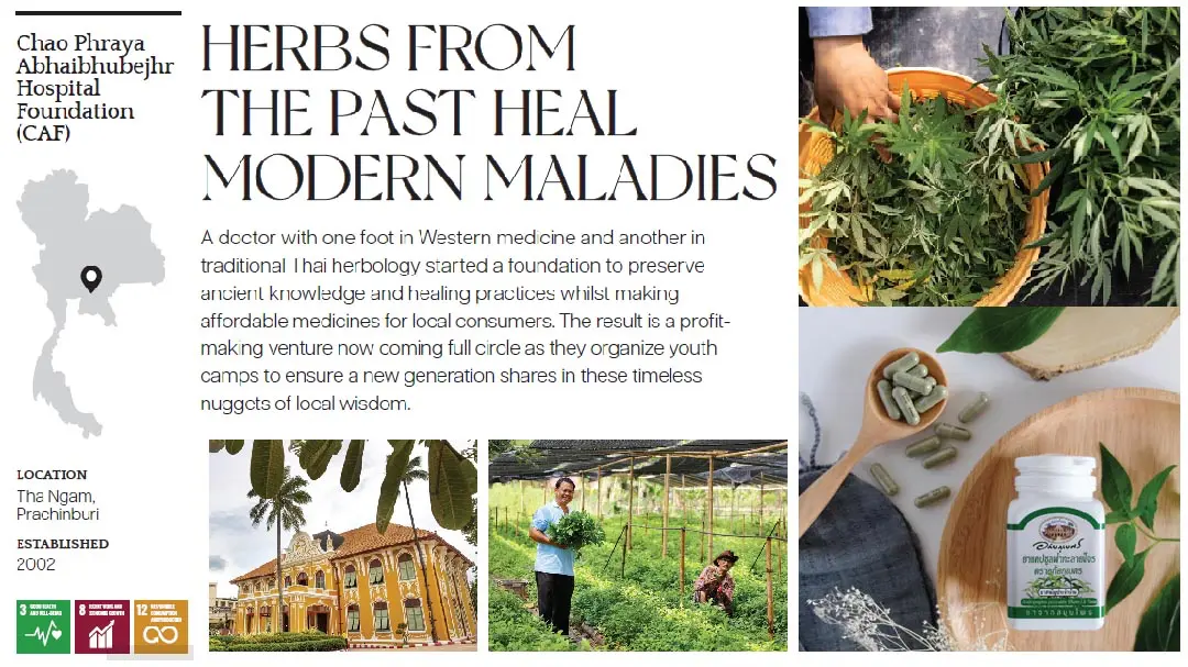 มูลนิธิโรงพยาบาลเจ้าพระยาอภัยภูเบศร แบ่งกำไรร้อยละ 70 จากการขายยาและเครื่องสำอางที่ผลิตจากสมุนไพรพื้นบ้าน สนับสนุนโรงพยาบาลเจ้าพระยาอภัยภูเบศรที่ใช้การแพทย์แบบตะวันตก ในขณะที่อีกร้อยละ 30 ใช้จัดกิจกรรมเพื่อถ่ายทอดภูมิปัญญาท้องถิ่นที่ไร้กาลเวลาเหล่านี้สู่สังคมวงกว้าง รวมถึงจัดค่ายเยาวชน แม้ว่ามูลนิธิฯ จะมียอดขายที่น่าประทับใจถึง 400 ล้านบาทในปี 2564 คุณหมอสุภาภรณ์กล่าวว่า “เราไม่ได้วัดความสำเร็จที่ตัวเงิน แต่อยู่ที่การกระตุ้นให้คนไทยตระหนักว่าภูมิปัญญาดั้งเดิม สมุนไพร และพืชที่มีอยู่แล้วนั้นเป็นสิ่งที่มีคุณค่า” ล่าสุดมูลนิธิได้รับบริจาคพื้นที่ 83 ไร่บนเขาใหญ่ ซึ่งมีแผนจะทำสวนสมุนไพรที่สามารถปลูกพืชที่มีศักยภาพทางยาที่ทีมอภัยภูเบศรค้นพบได้ทั้งหมด “ในช่วงชีวิตของฉัน เราอาจผลิตยาได้เพียง 20-30 ตัวเท่านั้น แต่เรามีพืชมากกว่า 2,000 ชนิดในบันทึก ถ้าใครอยากค้นคว้าเพิ่มเติมเกี่ยวกับการใช้พืชเหล่านี้ในทางการแพทย์ ก็สามารถมาที่สวนแห่งนี้ได้”