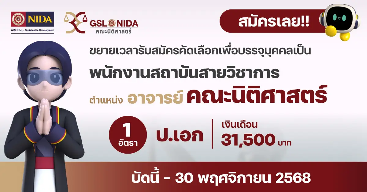 ประกาศรับสมัครคัดเลือกเพื่อบรรจุบุคคลเป็นพนักงานสถาบันสายวิชาการ ตำแหน่งอาจารย์ สังกัดรับสมัครอาจารย์ สังกัดคณะนิติศาสตร์ สถาบันบัณฑิตพัฒนบริหารศาสตร์