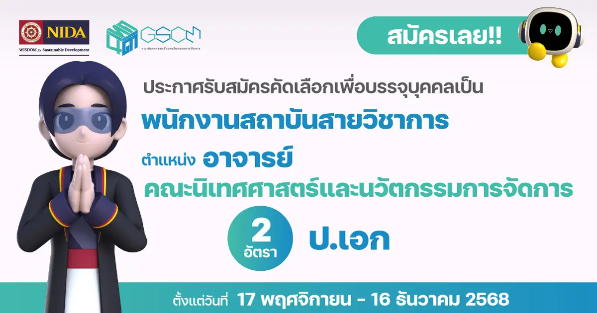 ตำแหน่งอาจารย์ สังกัดคณะนิเทศศาสตร์และนวัตกรรมการจัดการ สถาบันบัณฑิตพัฒนบริหารศาสตร์