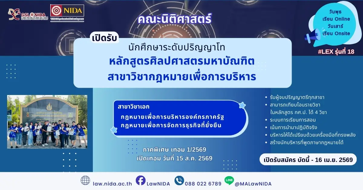 เพราะ “กฎหมาย” คือ เครื่องมือทรงพลัง ที่ช่วยให้คุณบริหารได้อย่างมีประสิทธิภาพ และหลักสูตร ศศ.ม. (Master of Arts in Law for Management) จาก NIDA ถูกออกแบบมาเพื่อสิ่งนี้