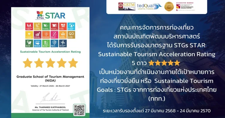 ข่าวสถาบัน คณะการจัดการการท่องเที่ยว (GSTM NIDA) ได้รับการรับรองมาตรฐาน STGs STAR: Sustainable Tourism Acceleration Rating 5 ดาว10 April 202510 April 2025SDG4
