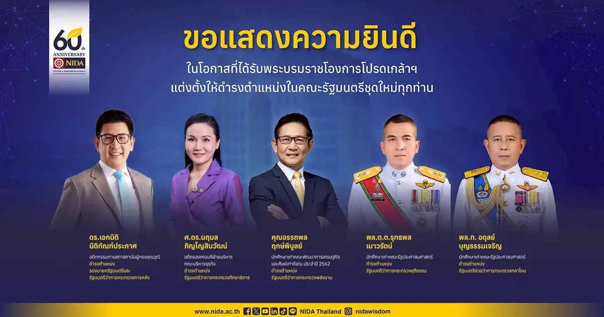 สถาบันบัณฑิตพัฒนบริหารศาสตร์ ขอแสดงความยินดีกับศิษย์เก่าและผู้ทรงคุณวุฒิทุกท่าน ที่ได้รับพระบรมราชโองการโปรดเกล้า ฯ แต่งตั้งให้ดำรงตำแหน่งในคณะรัฐมนตรีชุดใหม่