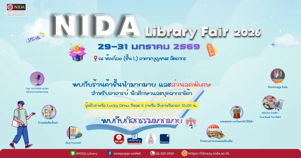 1 ปีมีครั้ง!! กับ NIDA Library Fair 2026 พบกับร้านหนังสือชั้นนำต่างๆมากมาย เช่น Kinokuniya , Chula Book, SE-ED Education Public Company Limited