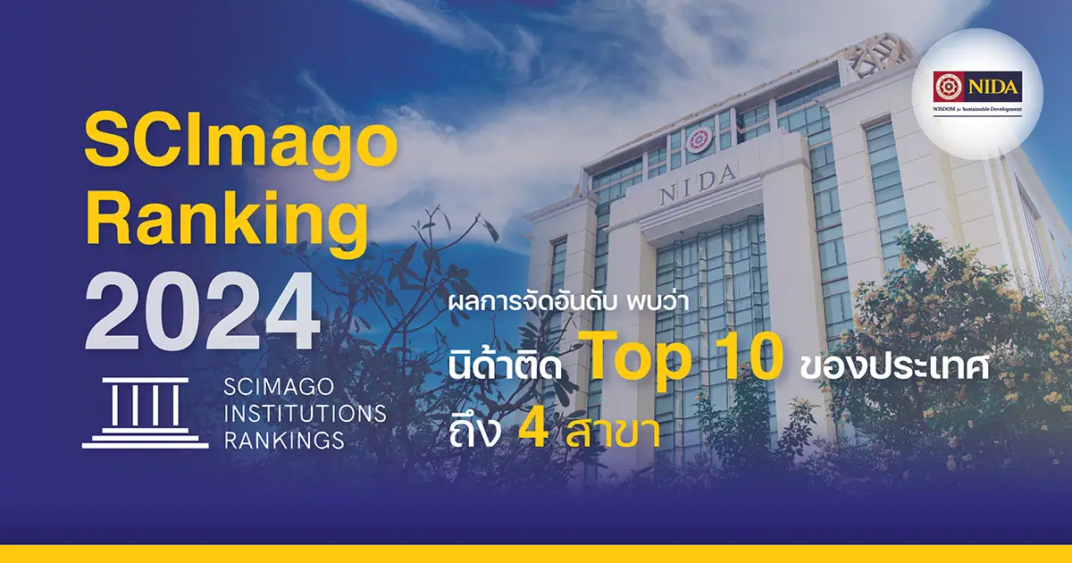 โดยการประกาศผล SCImago Institutions Ranking ประจำปี 2024 นี้ เป็นเรื่องน่ายินดีเป็นอย่างยิ่งที่ สถาบันบัณฑิตพัฒนบริหารศาสตร์ (นิด้า) ได้รับการจัดอันดับที่โดดเด่น ติด Top 10 ในประเภทสาขาวิชา (ระดับประเทศ) ถึง 4 สาขา ดังนี้
