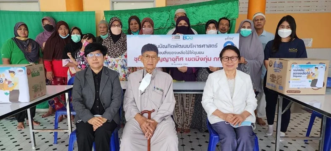 วันที่ 16 กุมภาพันธ์ 2566 สถาบันบัณฑิตพัฒนบริหารศาสตร์ (NIDA) นำโดย ผศ.ดร.แตงอ่อน มั่นใจตน ผู้อำนวยการโครงการสร้างความตระหนักรู้ด้าน BCG แก่เยาวชนและสร้างเสริมอาชีพ โดยยึดหลัก BCG แก่ชุมชน และ นางสาวนิภา ชุมสุข รักษาการแทนผู้อำนวยการกองวิเทศสัมพันธ์และสื่อสารองค์การ พร้อมด้วยเจ้าหน้าที่ส่วนสื่อสารองค์การ เดินทางไปมอบสิ่งของบริจาคภายใต้โครงการ NIDA USR แบ่งปันของเหลือใช้ให้ชุมชน ปี 2565 ครั้งที่ 2 ให้กับชุมชนสมัญญาอุทิศ เขตบึงกุ่ม โดยมีท่านมนตรี โซ๊ะประสิทธิ์ อิหม่ามมัสยิดมิฟตาฮุ้นยีนาน (ลำเจียก) และชาวชุมชนเป็นตัวแทนรับมอบ จากนั้นได้หารือเกี่ยวกับการจัดกิจกรรมสิ่งแวดล้อมเรื่องการคัดแยกขยะ และการฝึกอาชีพเพาะต้นอ่อนทานตะวันด้วย