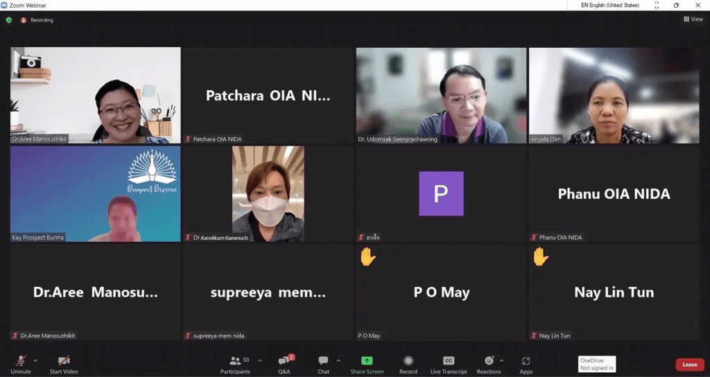 เมื่อวันที่ 12 มกราคม 2566 สถาบันได้เข้าร่วมกิจกรรม Virtual Information Sharing Session ซึ่งจัดโดย Prospect Burma นำโดย คุณ Angela Dim ตำแหน่ง Partner Relationships Manager และ คุณ Kay Khine Oo ตำแหน่ง Program Officer เพื่อประชาสัมพันธ์หลักสูตรนานาชาติ ให้แก่ ผู้เข้าร่วมเครือข่ายพันธมิตรจาก Prospect Burma สาธารณรัฐแห่งสหภาพเมียนมาร์ โดยการจัดกิจกรรมครั้งนี้ได้รับเกียรติจาก รองศาสตราจารย์ ดร.อุดมศักดิ์ ศีลประชาวงศ์ ผู้อำนวยการหลักสูตรเศรษฐศาสตร์และการบริหาร คณะพัฒนาการเศรษฐกิจ ผู้ช่วยศาสตราจารย์ ดร.อารี มโนสุทธิกิจ ผู้อำนวยการหลักสูตร M.A. in English Language Studies and Teaching คณะภาษาและการสื่อสาร และ รองศาสตราจารย์ ดร. กนกกานต์ แก้วนุช ผู้ช่วยคณบดีฝ่ายกิจการนานาชาติ คณะการจัดการการท่องเที่ยว มาร่วมนำเสนอหลักสูตร พร้อมทั้งร่วมพูดคุยตอบข้อซักถามให้แก่นักศึกษา และคณาจารย์ผู้เชี่ยวชาญ จากสาธารณรัฐแห่งสหภาพเมียนมาร์ จำนวน 50 คน ที่สนใจจะสมัครเข้าศึกษาต่อ ณ สถาบัน
