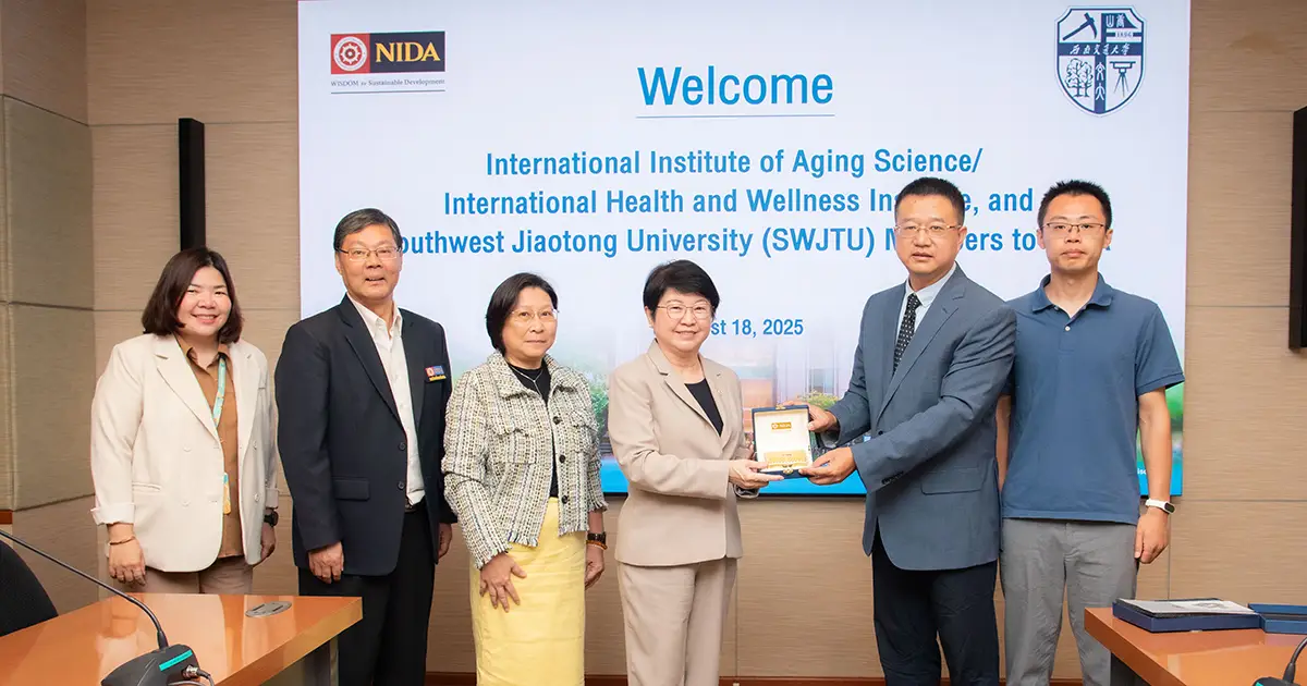 เมื่อวันที่ 18 สิงหาคม 2568 ศาสตราจารย์ ดร.ทิพวรรณ หล่อสุวรรณรัตน์ อธิการบดี รองศาสตราจารย์ ดร.หลี่ เหรินเหลียง รองคณบดีฝ่ายวิชาการ คณะพัฒนาสังคมและยุทธศาสตร์การบริหาร ดร.ศิวิกา ดุษฎีโหนด คณบดี คณะผู้บริหารคณะสถิติประยุกต์ นางสาวไพลิน เชื้อหยก ผู้จัดการโครงการสำรวจด้านสุขภาพ การสูงอายุและการเกษียณในประเทศไทย ศูนย์คลังปัญญาและสารสนเทศ และส่วนวิเทศสัมพันธ์ให้การต้อนรับและหารือความร่วมมือทางวิชาการกับผู้แทนจาก Southwest Jiaotong University (SWJTU) นำโดย Mr. Xu Junhua, Ph.D., Deputy Director, International Affairs Office จากสาธารณรัฐประชาชนจีน ณ ห้องประชุม 803 ชั้น 8 อาคารนราธิปพงศ์ประพันธ์ โดยมีเนื้อหาการหารือเกี่ยวกับการสร้างกิจกรรมความร่วมมือทางวิชาการด้านต่าง ๆ อาทิ โอกาสที่จะลงนามในบันทึกความเข้าใจ (MoU) การแลกเปลี่ยนคณาจารย์/นักวิชาการ/นักศึกษา/บุคลากร การร่วมจัดการฝึกอบรมให้แก่บุคลากรและนักศึกษา การร่วมวิจัยและตีพิมพ์ รวมถึงการจัดการประชุมวิชาการและโครงการความร่วมมือระดับนานาชาติ ซึ่งทั้งสองฝ่ายตกลงเห็นชอบที่จะประสานงานเพื่อดำเนินกิจกรรมความร่วมมือร่วมกันต่อไป