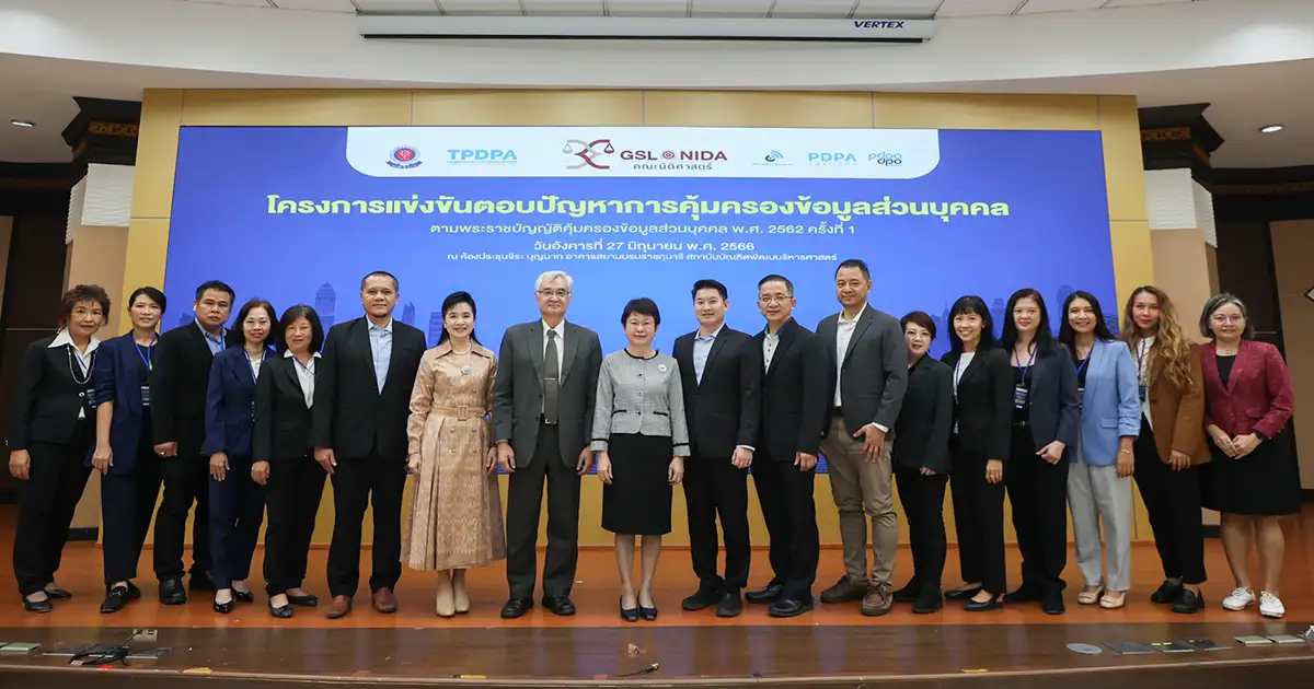 วันอังคารที่ 27 มิถุนายน 2566 ศูนย์กฎหมายเพื่อการพัฒนา คณะนิติศาสตร์ ร่วมกับ สมาคมนักศึกษาเก่าคณะนิติศาสตร์ สถาบันบัณฑิตพัฒนบริหารศาสตร์ สมาคมผู้ตรวจสอบและให้คำปรึกษาการคุ้มครองข้อมูลส่วนบุคคลไทย (TPDPA) บริษัท ดิจิทัล บิสิเนส คอนซัลท์ จำกัด บริษัท พีดีพีเอ (ไทยแลนด์) จำกัด บริษัท พีดีพีเอ แอนด์ ดีพีโอ จำกัด และสถาบันพัฒนาและทดสอบทักษะดิจิทัล (DDTI) จัดโครงการแข่งขันตอบปัญหาการคุ้มครองข้อมูลส่วนบุคคล ตามพระราชบัญญัติคุ้มครองข้อมูลส่วนบุคคล พ.ศ.2562 ครั้งที่ 1 ชิงรางวัลมูลค่ากว่า 20,000 บาท ณ ห้องประชุมจีระ บุญมาก อาคารสยามบรมราชกุมารี สถาบันบัณฑิตพัฒนบริหารศาสตร์ กรุงเทพฯ