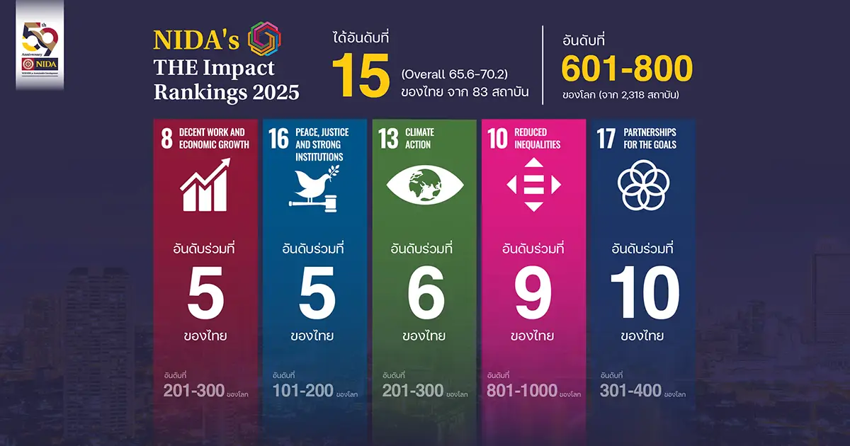 เป็นข่าวที่น่ายินดีและน่าภาคภูมิใจร่วมกันของประชาคมนิด้าทุกภาคส่วน ที่แสดงให้เห็นถึงความมุ่งมั่นและความสำเร็จของ ‘นิด้า’ ในการขับเคลื่อนเป้าหมายการพัฒนาที่ยั่งยืน ตามวิสัยทัศน์และพันธกิจของสถาบัน ที่มุ่งมั่นสู่การเป็น “สถาบันสรรค์สร้างปัญญาของสังคม และสร้างผู้นำ เพื่อไปสู่การพัฒนาที่ยั่งยืน ในระดับสากล”