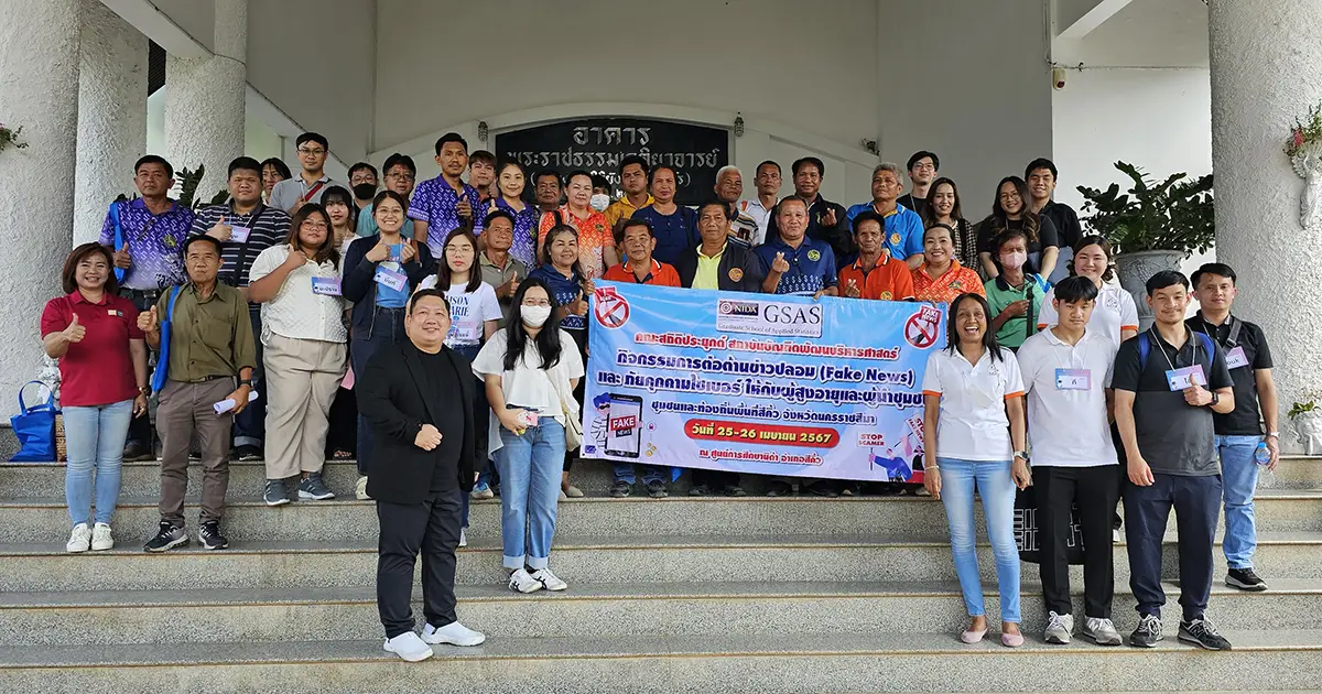 นักศึกษาภาคปกติ รุ่น 1/2565 และ 2/2565 คณะสถิติประยุกต์ ได้เข้าร่วมกิจกรรมเพื่อสังคม โครงการ “การต่อต้านข่าวปลอม (Fake news) และภัยคุกคามไซเบอร์ ให้กับผู้สูงอายุและผู้นำชุมชน : ชุมชนและท้องถิ่นพื้นที่สีคิ้ว จังหวัดนครราชสีมา” ในวันพฤหัสบดีที่ 25 เมษายน 2567 ณ ศูนย์การการศึกษานิด้า อำเภอสีคิ้ว จังหวัดนครราชสีมา ขอขอบคุณอาจารย์ ดร.ธนชาตย์ ฤทธิ์บำรุง อาจารย์ที่ปรึกษาโครงการกิจกรรม , ผู้ช่วยศาสตราจารย์หนึ่งหทัย ขอผลกลาง อาจารย์ประจำสาขาวิชานิเทศศาสตร์ดิจิทัล สำนักวิชาศาสตร์และศิลป์ดิจิทัล มหาวิทยาลัยเทคโนโลยีสุรนารี ที่ให้เกียรติเป็นวิทยากรในการอบรมครั้งนี้ อีกทั้ง ขอขอบคุณนายฉกาจ ภูมิจันทึก กำนันชุมชนบ้านลาดบัวขาว ,ผู้นำชุมชนทุกหมู่บ้าน และผู้เข้าร่วมอบรมทั้ง 50 ท่าน ที่สละเวลาเพื่อเข้าร่วมกิจกรรมครั้งนี้ให้สำเร็จลุล่วงไปได้ด้วยดี คณะสถิติประยุกต์ หวังเป็นอย่างยิ่งว่าจะได้ร่วมทำกิจกรรมเพื่อสังคมเช่นนี้ในโอกาสต่อไป