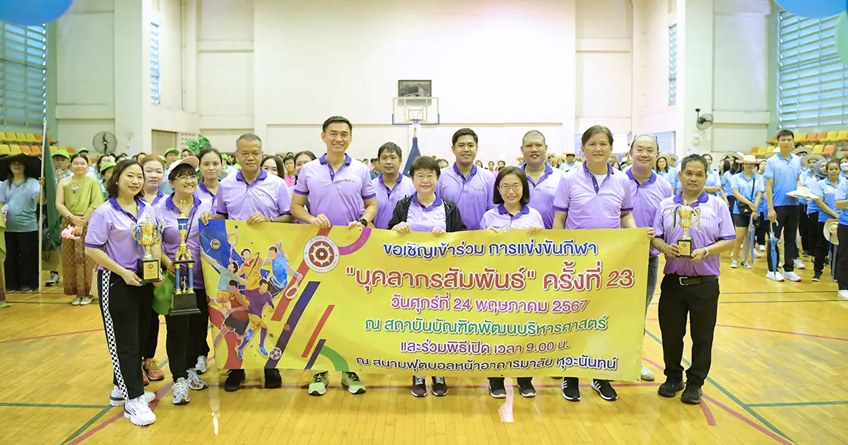 เมื่อวันศุกร์ที่ 24 พฤษภาคม 2567 สถาบันบัณฑิตพัฒนบริหารศาสตร์ (NIDA) โดยส่วนสวัสดิการและสิทธิประโยชน์ กองบริหารและพัฒนาทรัพยากรบุคคล จัดงาน “กีฬาบุคลากรสัมพันธ์ สถาบันบัณฑิตพัฒนบริหารศาสตร์ ครั้งที่ 23” ณสนามกีฬาในร่ม ชั้น 2 อาคารชุบ กาญจนประกร โดยได้รับเกียรติจาก ศ.ดร.ทิพวรรณ หล่อสุวรรณรัตน์ อธิการบดี เป็นประธานกล่าวเปิดงาน และ รศ.ดร.ประพนธ์ สหพัฒนา รองอธิการบดีฝ่ายบริหารและเทคโนโลยีดิจิทัล กล่าวรายงานวัตถุประสงค์และการดำเนินงาน