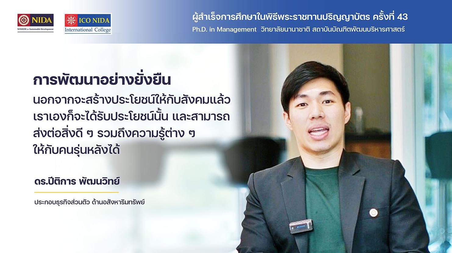 มาร่วมเปิดมุมมอง “การพัฒนาที่ยั่งยืน” ไปด้วยกัน ผ่านบทสัมภาษณ์จากผู้สำเร็จการศึกษา PhD in Management วิทยาลัยนานาชาติ สถาบันบัณฑิตพัฒนบริหารศาสตร์ “ดร.ปีติการ พัฒนวิทย์”