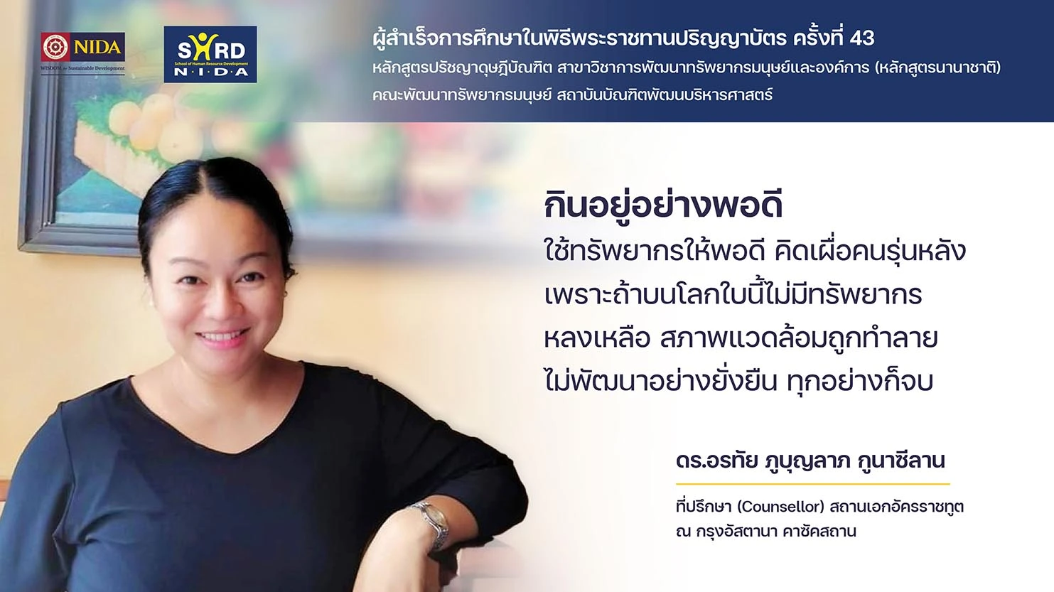 “กินอยู่อย่างพอดี ใช้ทรัพยากรให้พอดี คิดเผื่อคนรุ่นหลัง เพราะถ้าบนโลกใบนี้ไม่มีทรัพยากรหลงเหลือ สภาพแวดล้อมถูกทำลาย ไม่พัฒนาอย่างยั่งยืน ทุกอย่างก็จบ” ดร.อรทัย ภูบุญลาภ กูนาซีลาน ตัวแทนผู้สำเร็จการศึกษา คณะพัฒนาทรัพยากรมนุษย์ ที่มองว่าเราในฐานะผู้ใช้ทรัพยากรโลกในปัจจุบัน ต้องคิดเผื่อคนรุ่นหลังให้มีทรัพยากรใช้ต่อไป