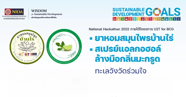ข่าวสาร ยาหอมสมุนไพร บ้านไร่ และ สเปรย์แอลกอฮอล์ล้างมือกลิ่นมะกรูด – กิจกรรม National Hackathon 2022 ภายใต้โครงการ U2T for BCG1 November 202215 November 2023SDG1SDG12