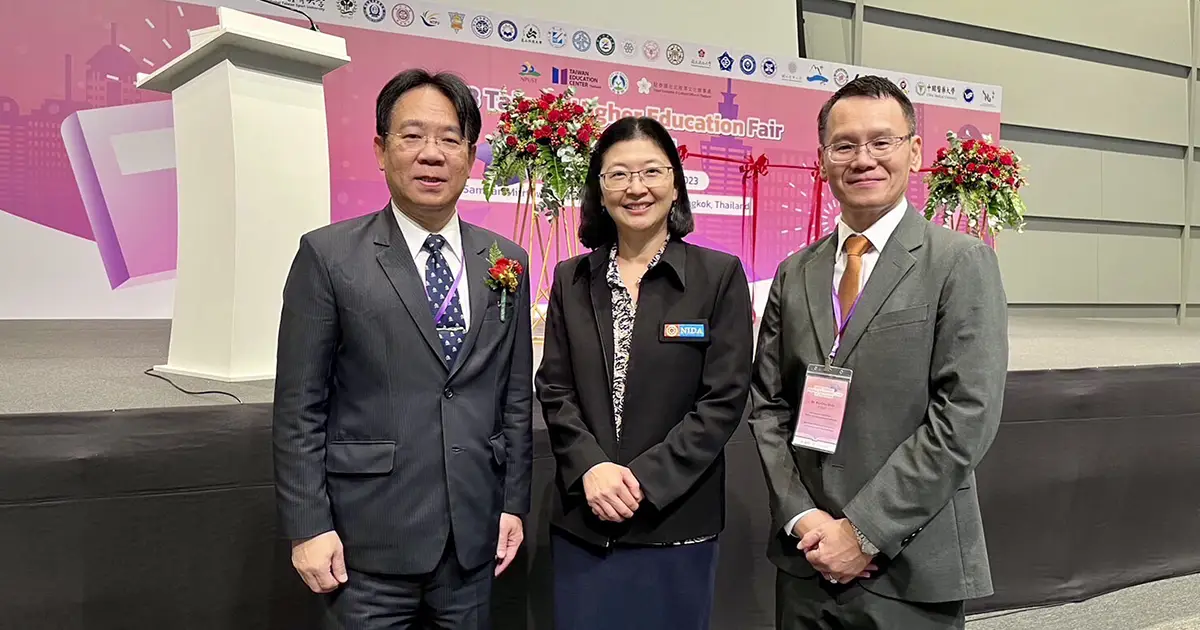 ผู้ช่วยศาสตราจารย์ ดร.อารี มโนสุทธิกิจ ผู้ช่วยอธิการบดีฝ่ายกิจการนานาชาติ ในนามผู้แทนสถาบันบัณฑิตพัฒนบริหารศาสตร์ เข้าร่วมพิธีเปิดงานนิทรรศการไต้หวัน ประจำปี 2566 และได้พบปะพูดคุยกับ Chin-Lung Chang, Ph.D. ตำแหน่ง NPUST President และ Vincent Ru-Chu Shih, Ph.D. ตำแหน่ง Professor and Dean, Office of International Affairs & College of Humanities and Social Sciences, National Pingtung University of Science and Technology (NPUST) ไต้หวัน จีน ในวันเสาร์ที่ 26 สิงหาคม 2566 ณ สามย่านมิตรทาวน์ กรุงเทพฯ เพื่อติดต่อสร้างความสัมพันธ์และผลักดันให้เกิดความร่วมมือกันทางด้านการศึกษาและด้านงานวิจัยกับมหาวิทยาลัยชั้นนำทั้งในมหาวิทยาลัยต่าง ๆ ในประเทศไทยและไต้หวัน จีน