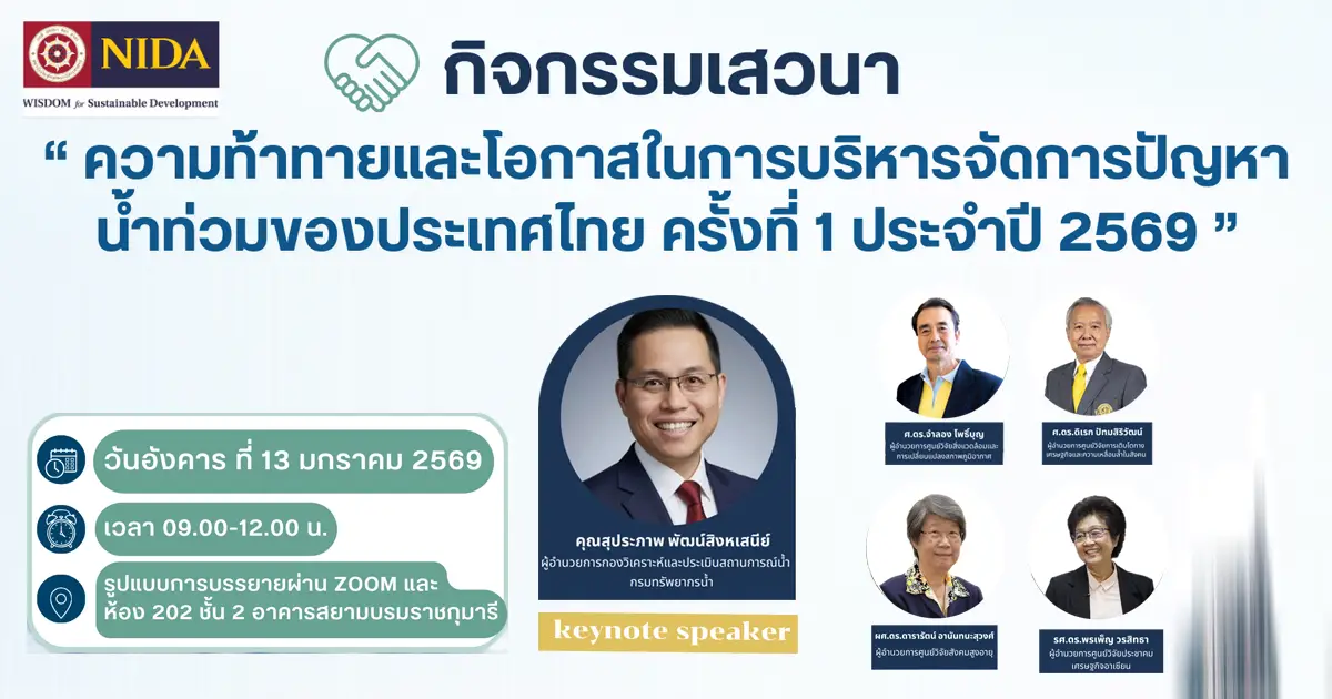 ขอเชิญร่วมกิจกรรมเสวนาวิชาการ “ความท้าทายและโอกาสในการบริหารจัดการปัญหาน้ำท่วมของประเทศไทย” ครั้งที่ 1 ประจำปีงบประมาณ 2569