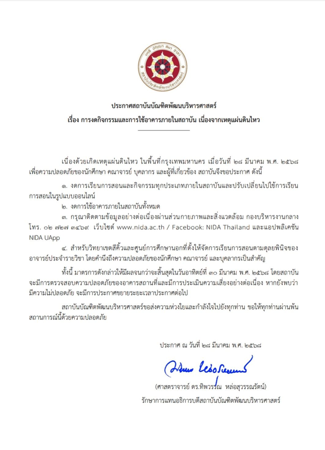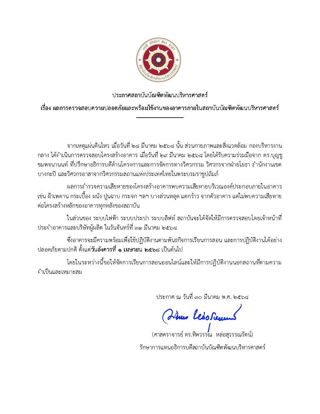 - ประกาศสถาบันบัณฑิตพัฒนบริหารศาสตร์ เรื่อง งดกิจกรรมและการใช้อาคารภายในสถาบัน เนื่องจากเหตุแผ่นดินไหว ลงวันที่ 28 มีนาคม 2568