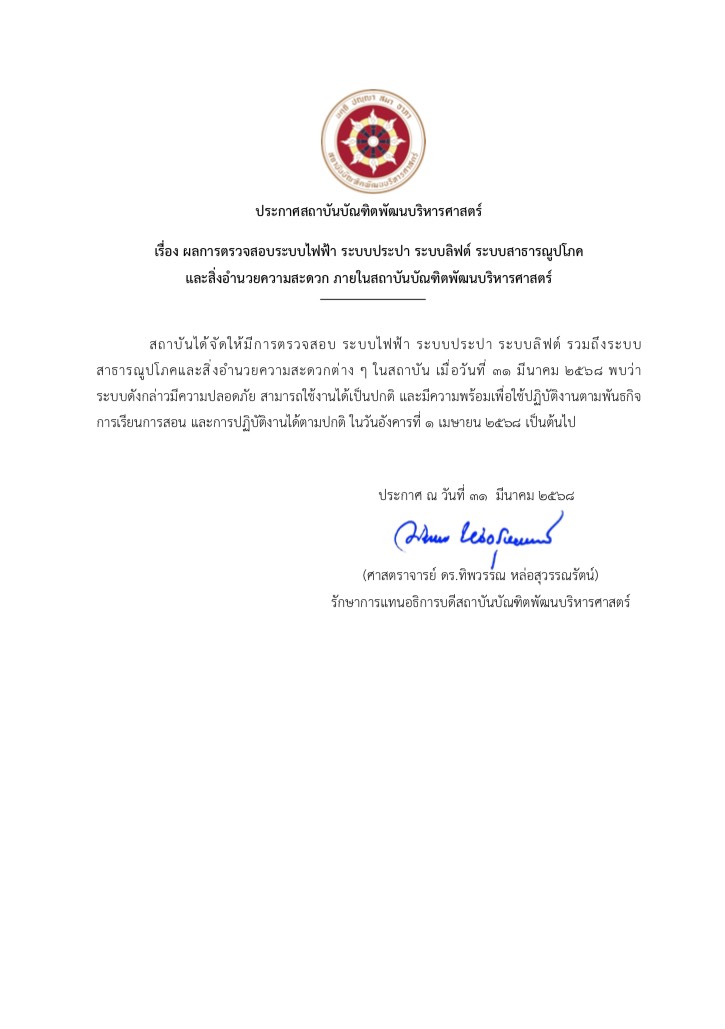 - ประกาศสถาบันบัณฑิตพัฒนบริหารศาสตร์ เรื่อง ผลการตรวจสอบระบบไฟฟ้า ระบบประปา ระบบลิฟต์ ระบบสาธารณูปโภค และสิ่งอำนวยความสะดวก ภายในสถาบันบัณฑิตพัฒนบริหารศาสตร์ ลงวันที่ 31 มีนาคม 2568
