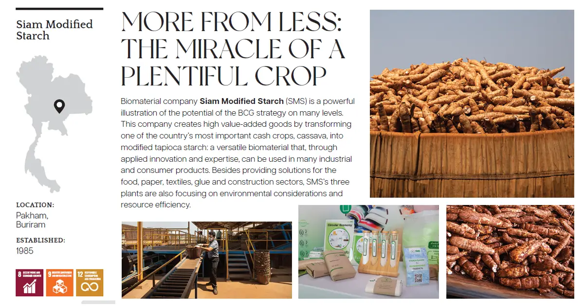 Siam Modified Starch เป็นตัวอย่างของการขับเคลื่อนกลยุทธ์ BCG ในหลายระดับ จากการพัฒนาสินค้าที่มีมูลค่าเพิ่มสูงด้วยการเปลี่ยนมันสำปะหลัง ซึ่งเป็นพืชเศรษฐกิจที่สำคัญที่สุดชนิดหนึ่งของประเทศ ให้กลายเป็นแป้งมันสำปะหลังแปรรูป ซึ่งเป็นวัสดุชีวภาพอเนกประสงค์ โดยใช้งานวิจัยค้นหาแนวทางการใช้ศักยภาพของ ‘แป้งมัน’ อย่างชาญฉลาด ตั้งแต่อาหาร ไปจนถึง กระดาษเคลือบ ตั้งแต่สิ่งทอ ไปจนถึงพลาสเตอร์ก่อสร้าง และยังมุ่งเน้นไปที่กระบวนการผลิตที่ใช้ทรัพยากรอย่างมีประสิทธิภาพและรักษาสิ่งแวดล้อม.